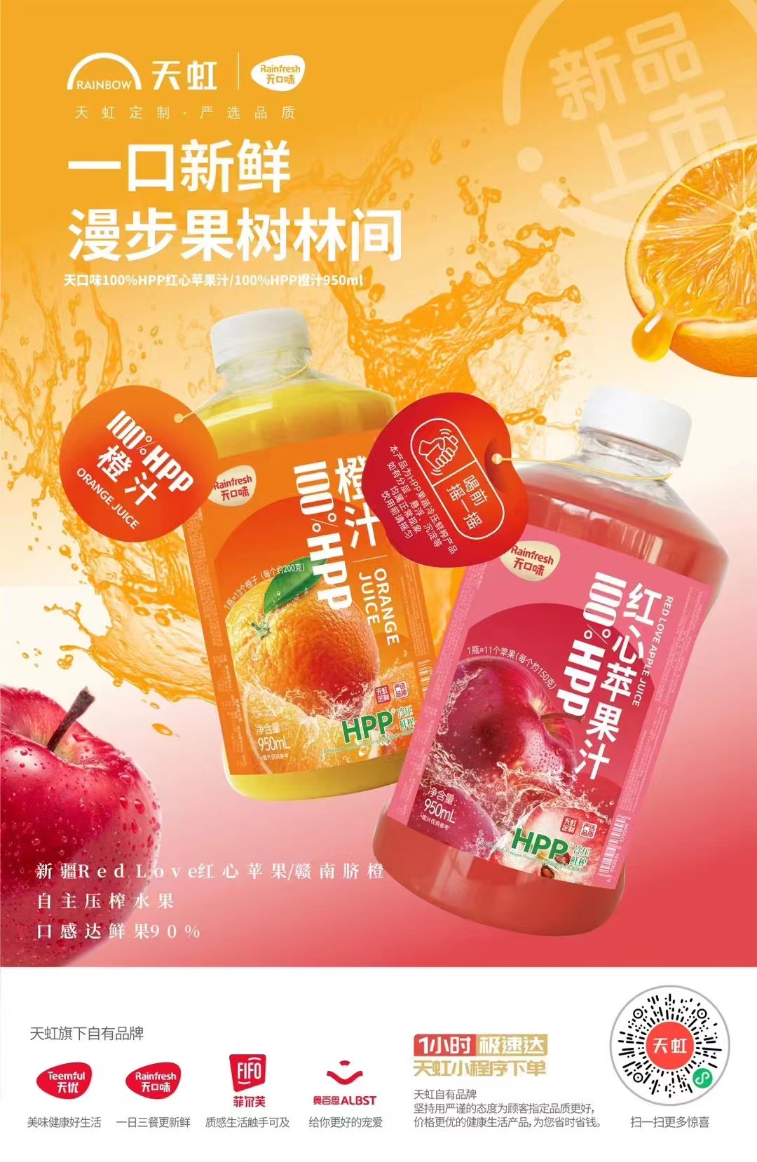 • 天口味HPP新疆红心苹果汁/赣南脐橙汁